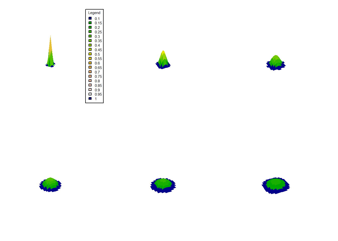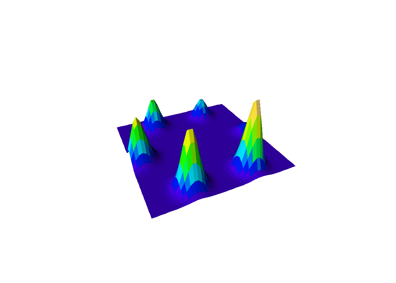 # 'a' controls peak height; larger sdx/sdy produce broader, flatter islands.