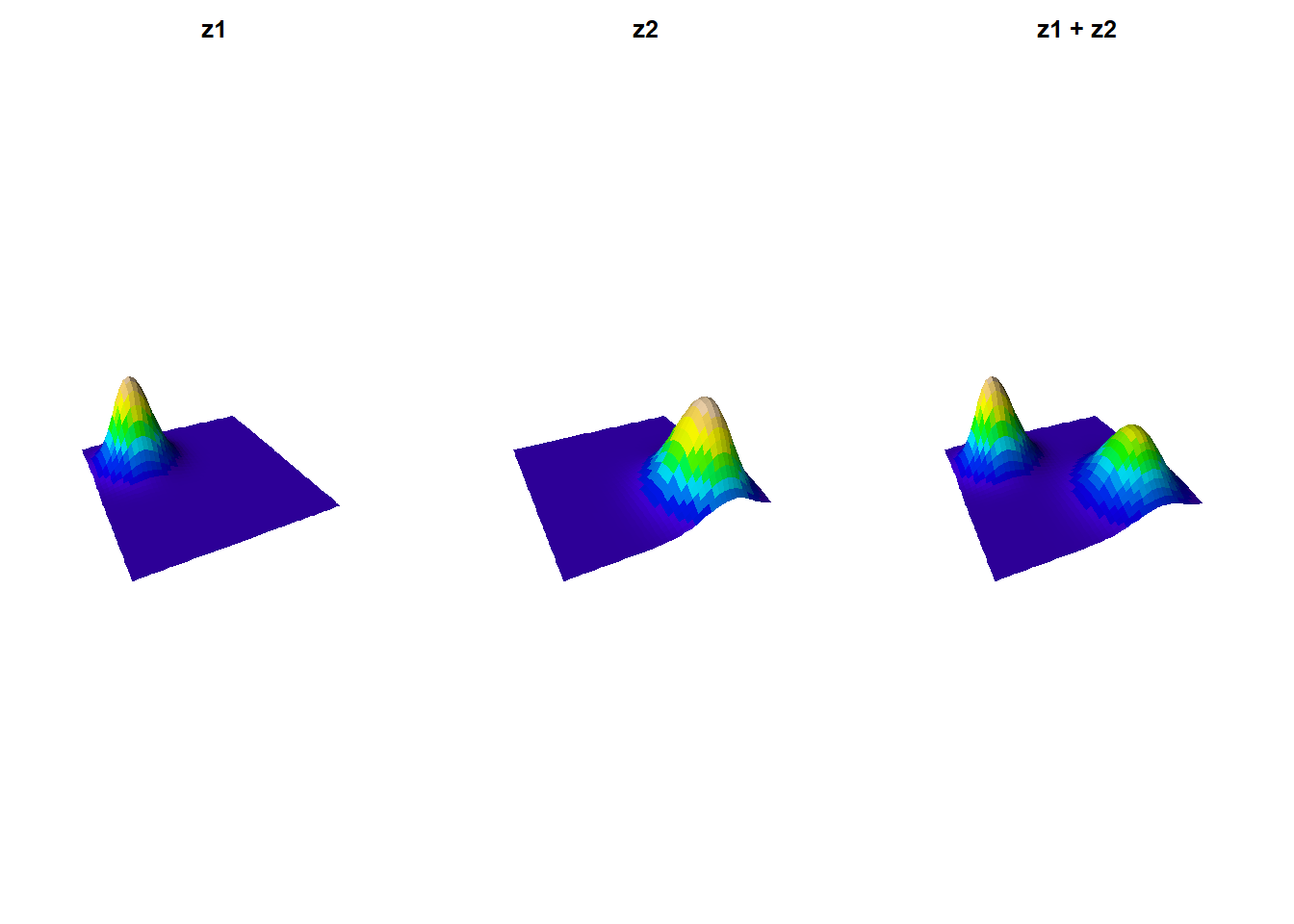 zf <- zf+outer(x, y, gaussian_2d, x0=sample(x,1), y0=sample(y,1), sdx=rnorm(1,2,5), sdy=rnorm(1,2,5), a=rnorm(1,2,2))