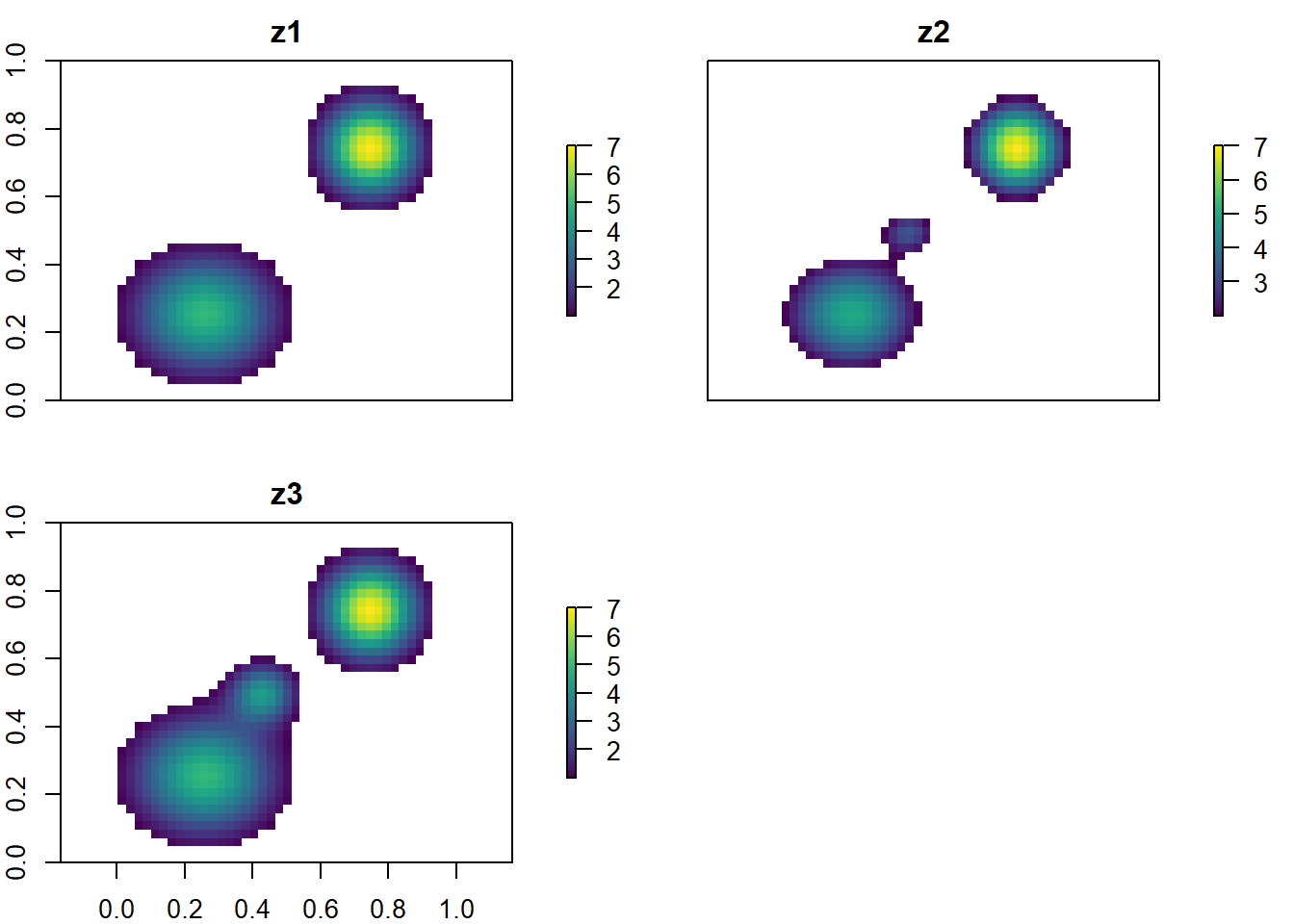 z_i <- outer(x, y, gaussian_2d, x0=x_values[island_i], y0=y_values[island_i], sdx=2, sdy=2, a=island_i*100) # times 100 for meter