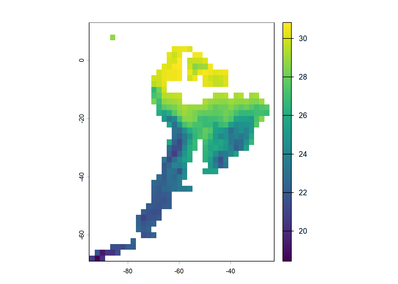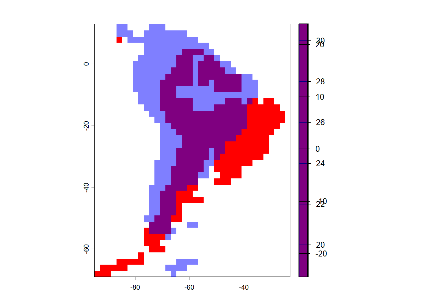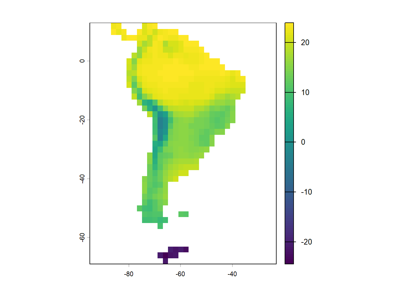 Now we will repeat the drill with some more realistic paleoenvironmental reconstruction of South American temperature and aridity at a coarse spatial resolution of 2 degrees, and at a temporal resolution of 1 million years. This is a very rough temporal resolution but should do for our purpose. Load it in and investigate some of it’s features.