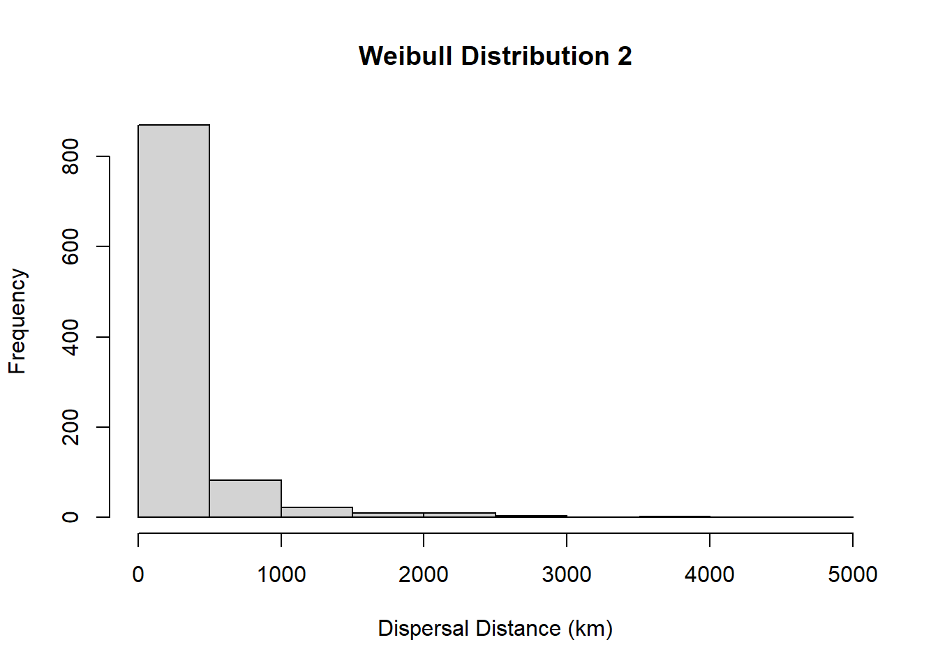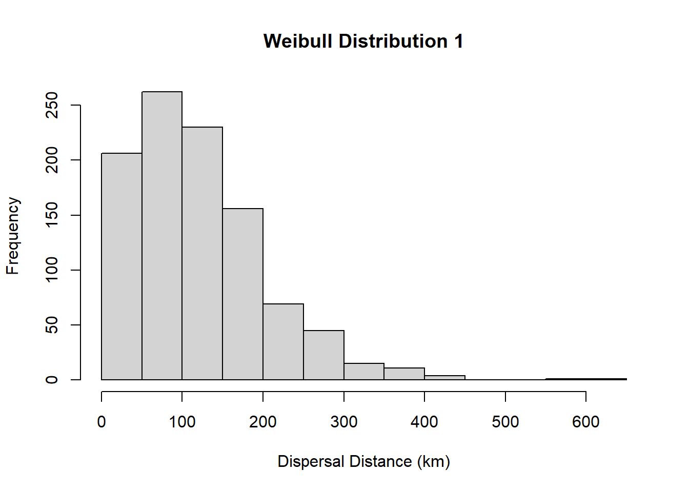 hist(rweibull(1000, 1.5, 133), main="Weibull Distribution 1", xlab="Dispersal Distance (km)")