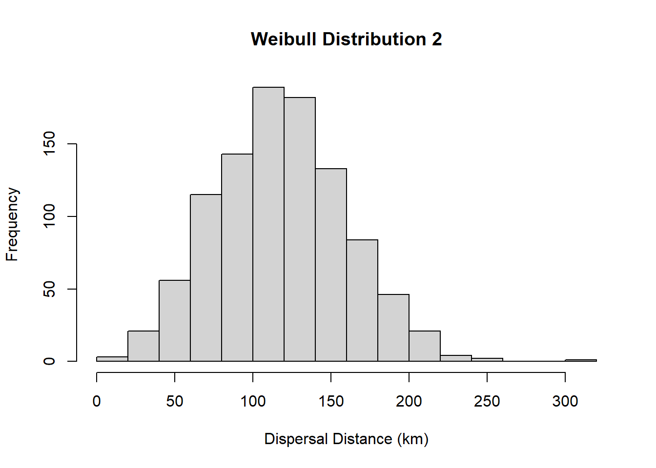 Here we set the maximum dispersal distance as infinty (e.g., no maximum), and we draw the dispersal values from a Weibull distribution with shape parameter = 1.5 and scale = 133. We can see what this distribution looks like by plotting a histogram.